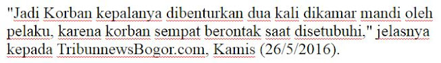 Sadisnya Bukan Hanya itu, tapi ternyata pelaku juga membenturkan kepala korban dikamar mandi karena korban berontak saat disetubihi Buktinya Telah ditemukan luka bagian kepala belakang korban juga ditemukan bekas benturan.